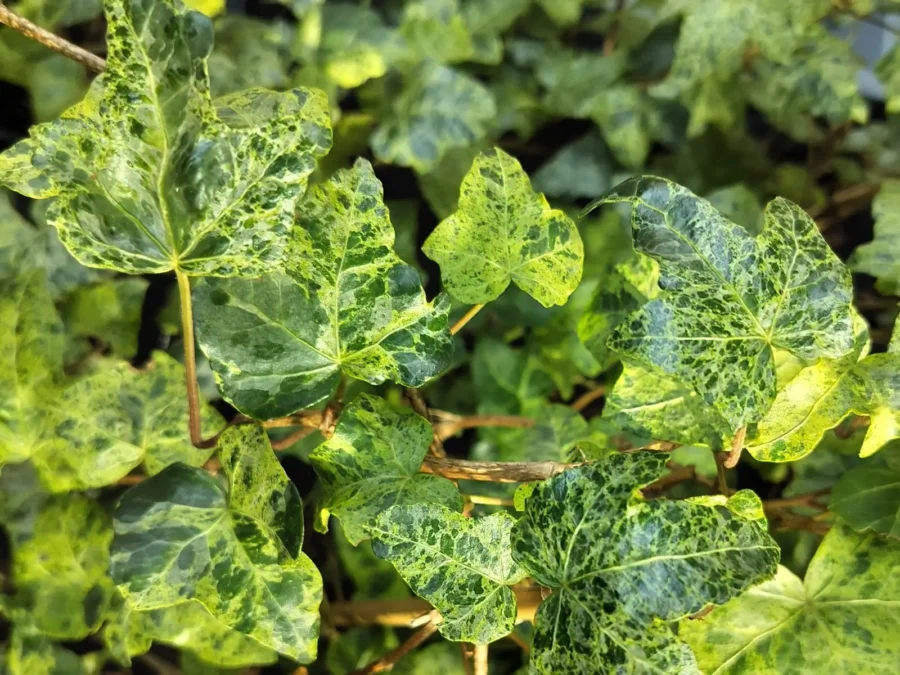 Zier-Efeu, Hedera helix ‘Gold Medal’, Der Efeu hat breite, dreieckige, dreifach gelappte Blätter, die grün mit gelben und grauen Sprenkeln sind.