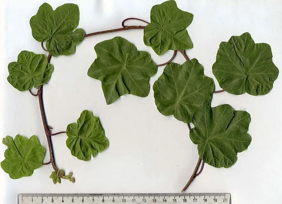 But the leaves are larger and flatter, less crinkled and less wavy. The number of lobes ranges from 0 to 5, usually 3, with shallow sinuses. The base of the leaves is cordate. Medium green in ordinary weather, the leaves can turn red in cold weather.