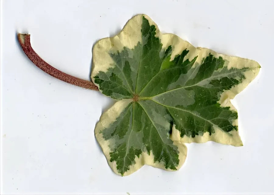 Ornamental ivy, Hedera helix ‘Nena’, It has fan-shaped leaves composed mainly of 5 lobes, to which 2 additional auricular lobes are sometimes added. The sinus between the terminal and lateral lobes is often fluted with the crest of the undulation pointing upwards. The reddish petiole is often flattened, which is an important identification feature.