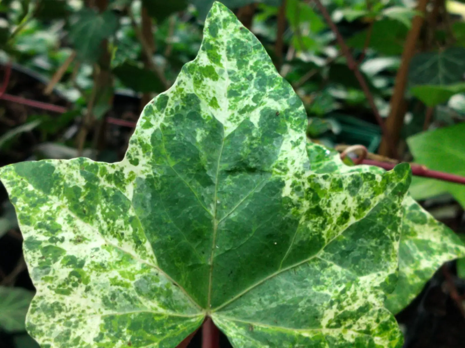 Edera marocchina, Hedera maroccana ‘Nabar-Nabar’, présente un très joli feuillage blanc ou crème tacheté de vert foncé avec des tiges et des pétioles rouges. En basque, ‘Nabar-Nabar’ signifie très panaché. Ce lierre du Maroc porte bien son nom.