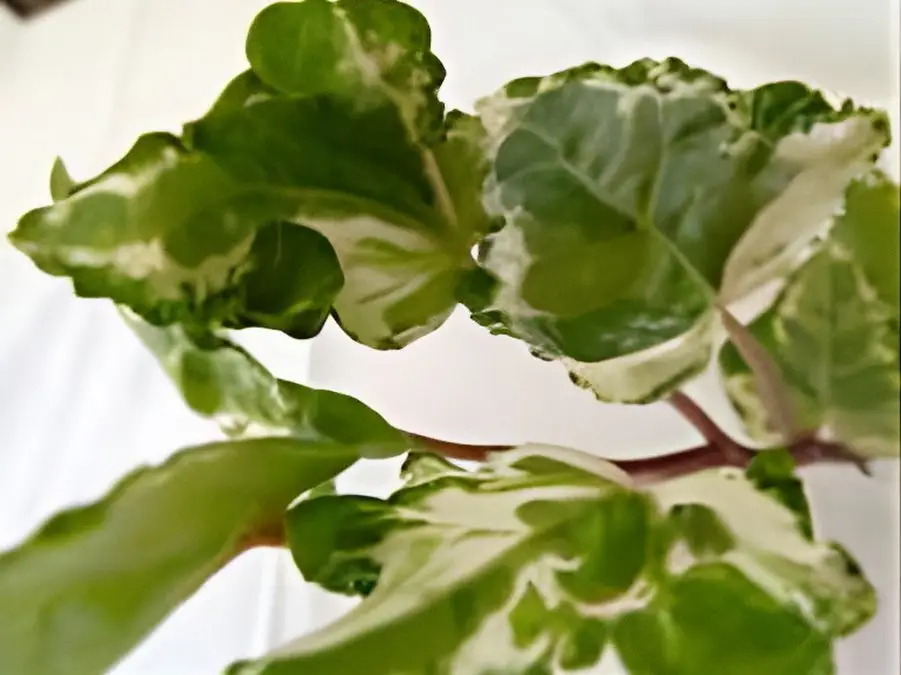 Les feuilles, de taille moyenne, sont composées de 3 lobes aux sinus si peu profonds qu’elles semblent être presque rondes. Le bord du limbe est parfois crispé. La feuille est colorée de vert mat et de gris, et marginée de blanc.