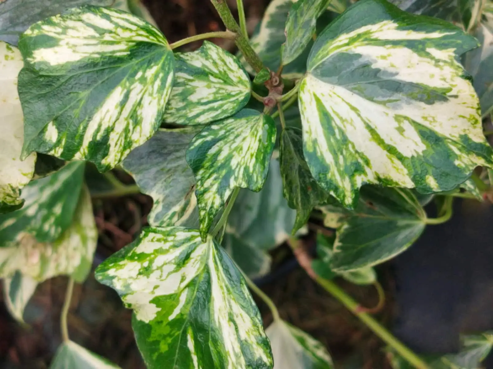 Le voici dans sa version adulte. Hedera helix ‘Nadine’ adulte forme un petit buisson très joliment panaché, avec des nuances de vert jaune et de vert pomme sur un fond crème à blanc.